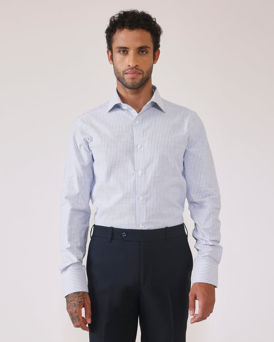 Add a touch of casual sophistication to your wardrobe with this tailored navy blue seersucker...