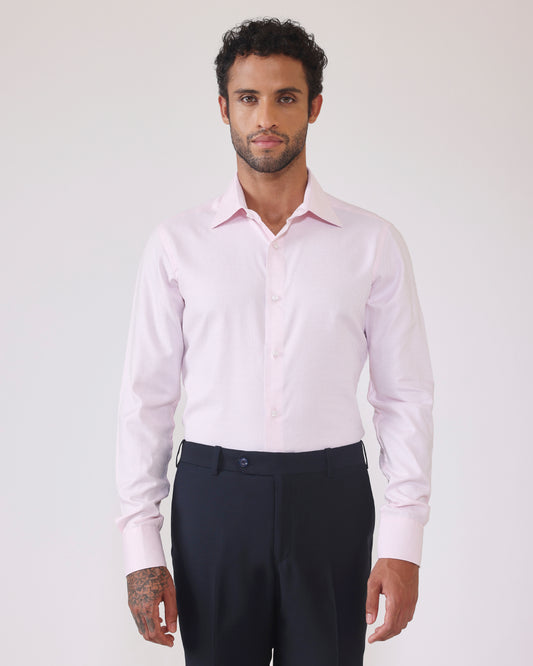 Make a refined statement with this tailored light pink jacquard shirt, crafted from premium Giza...