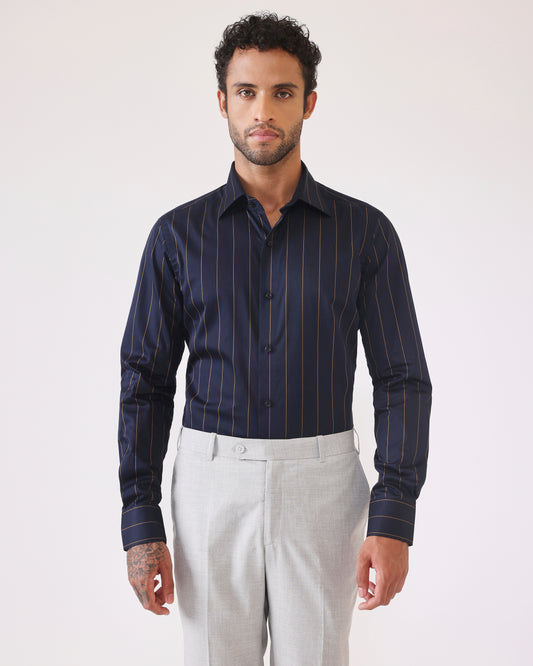 Make a bold yet refined statement with this tailored navy blue shirt, featuring a striking...