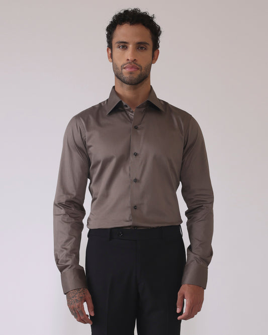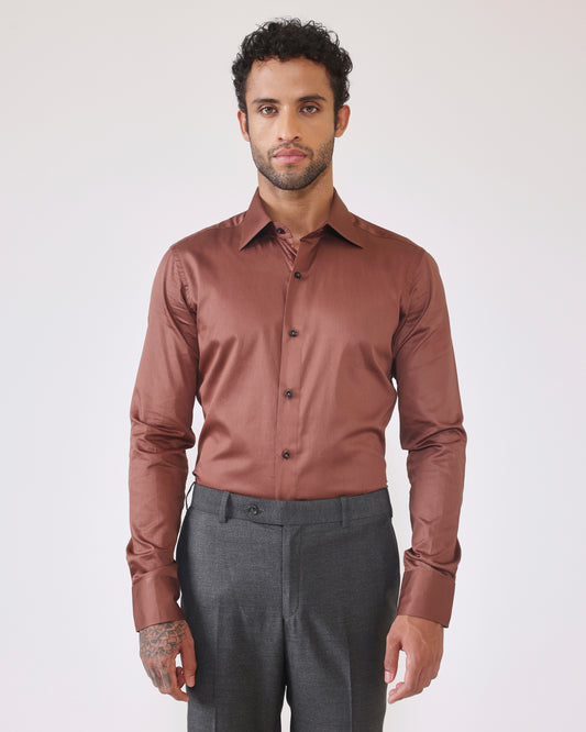 Make a bold yet elegant statement with this tailored dark brown shatin Giza cotton shirt....