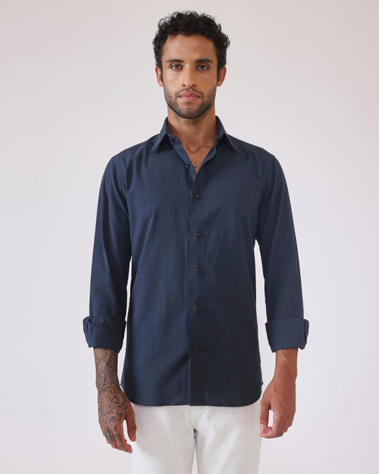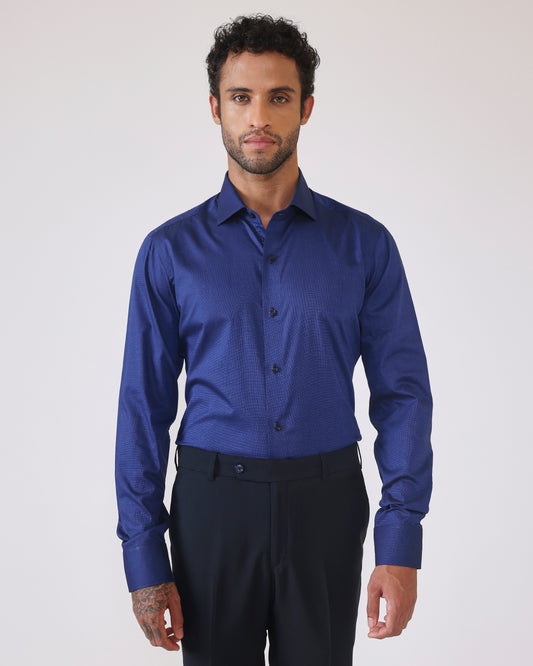 Step up your formal wardrobe with this luxurious navy blue premium dobby shirt, made from...