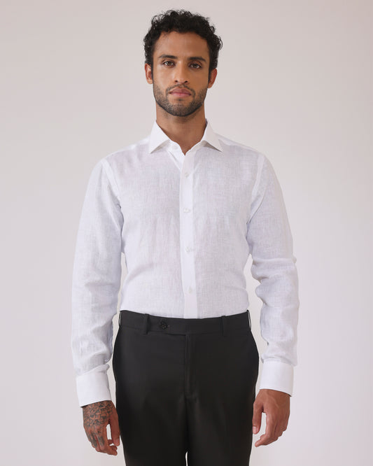 Elevate your formal attire with this impeccably tailored white pure linen shirt. Made from high-quality...