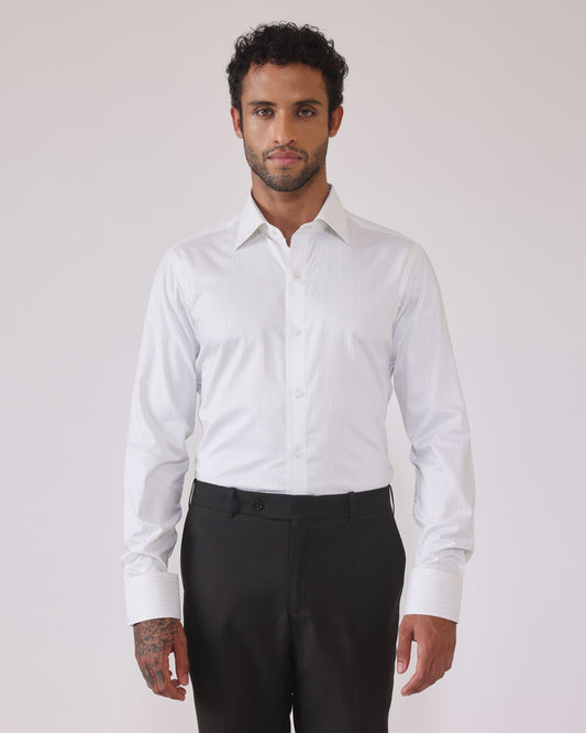 Elevate your professional wardrobe with this impeccably tailored white self-stripe Giza cotton shirt. Crafted from...