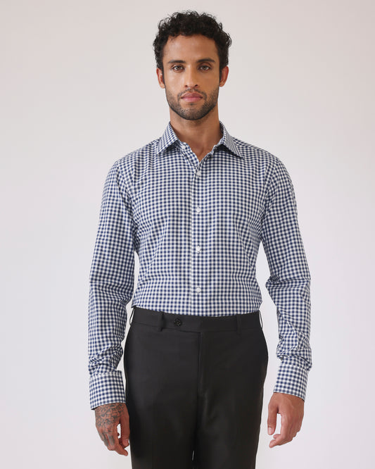 Introduce a touch of sophistication to your formal wardrobe with this tailored navy blue checks...