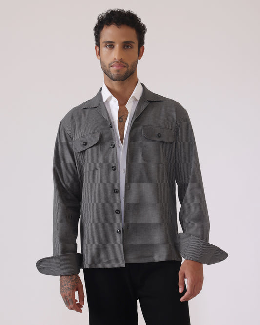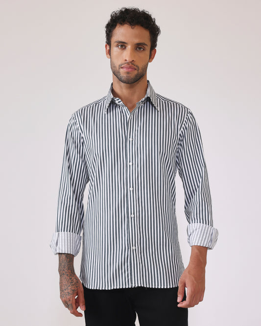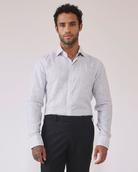 Elevate your formal wardrobe with this tailored grey and white striped pure linen shirt. Crafted...