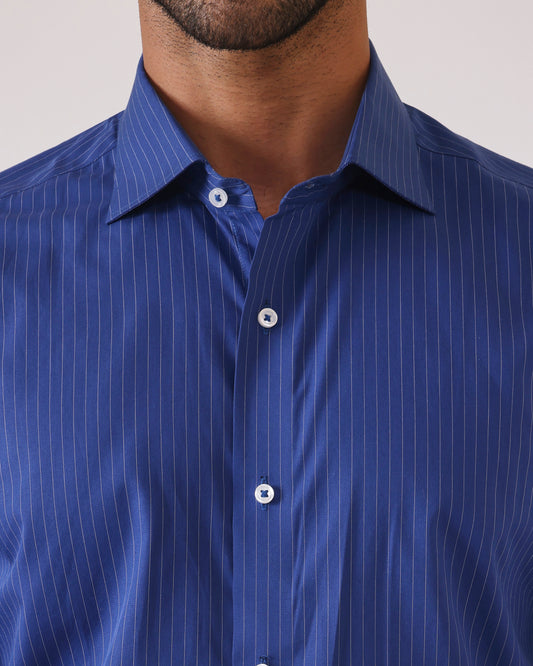 Refresh your casual wardrobe with this tailored blue stripes Giza cotton shirt. Crafted from premium...