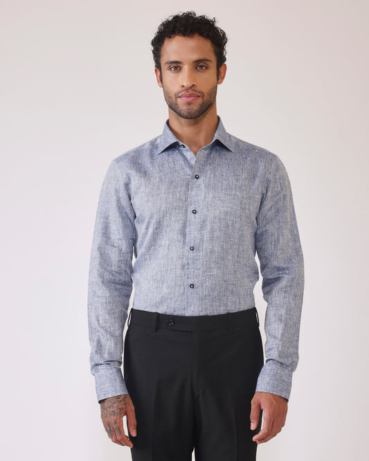 This tailored shirt, made from premium bluish gray pure linen, brings together comfort and modern...